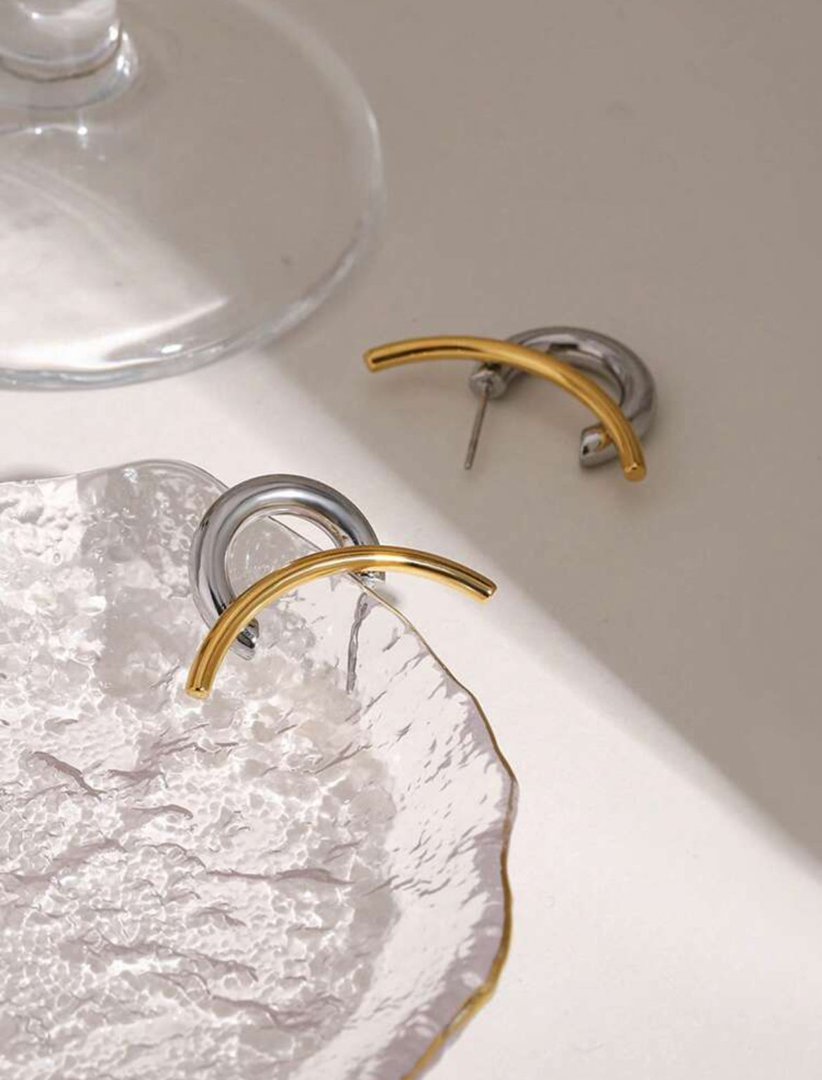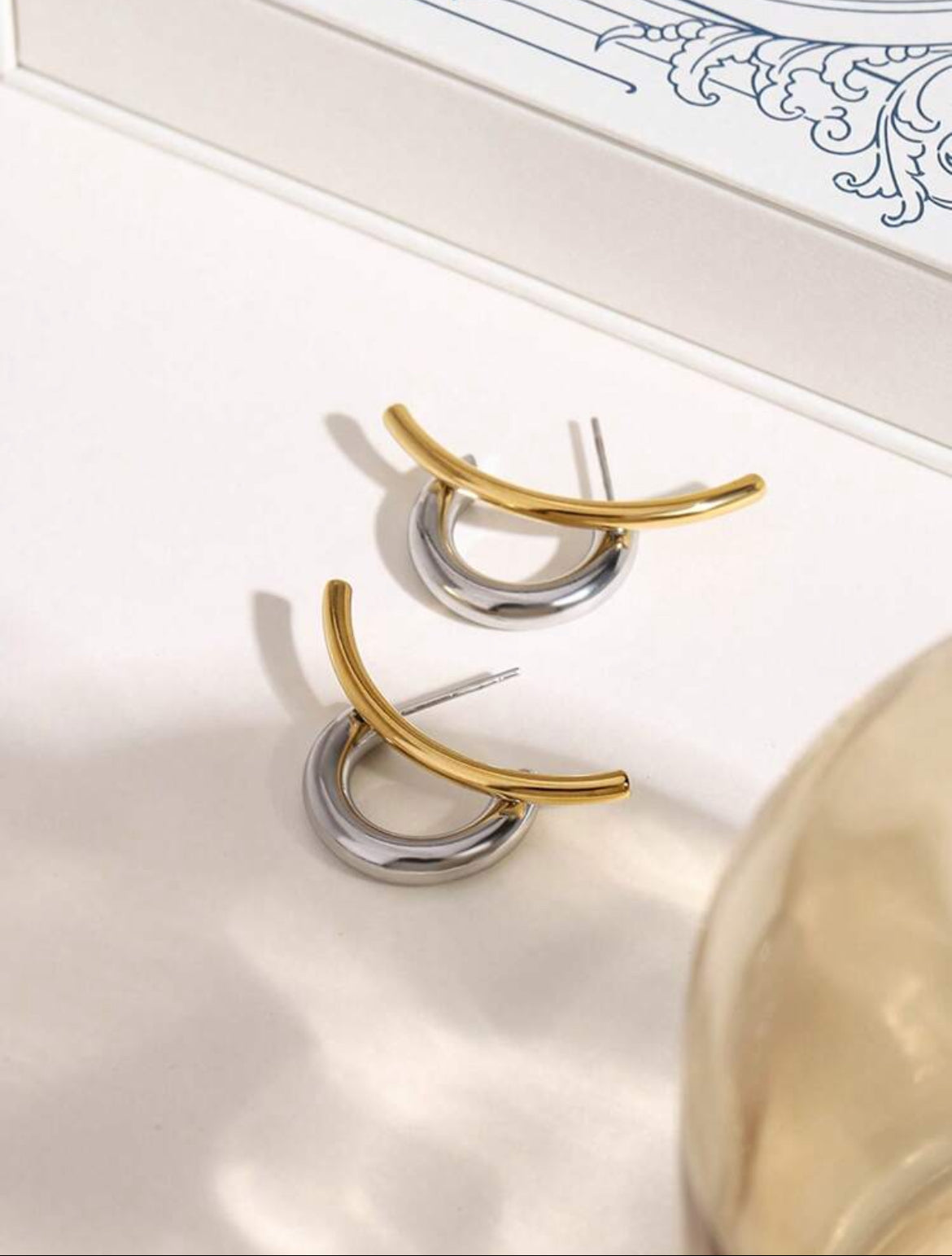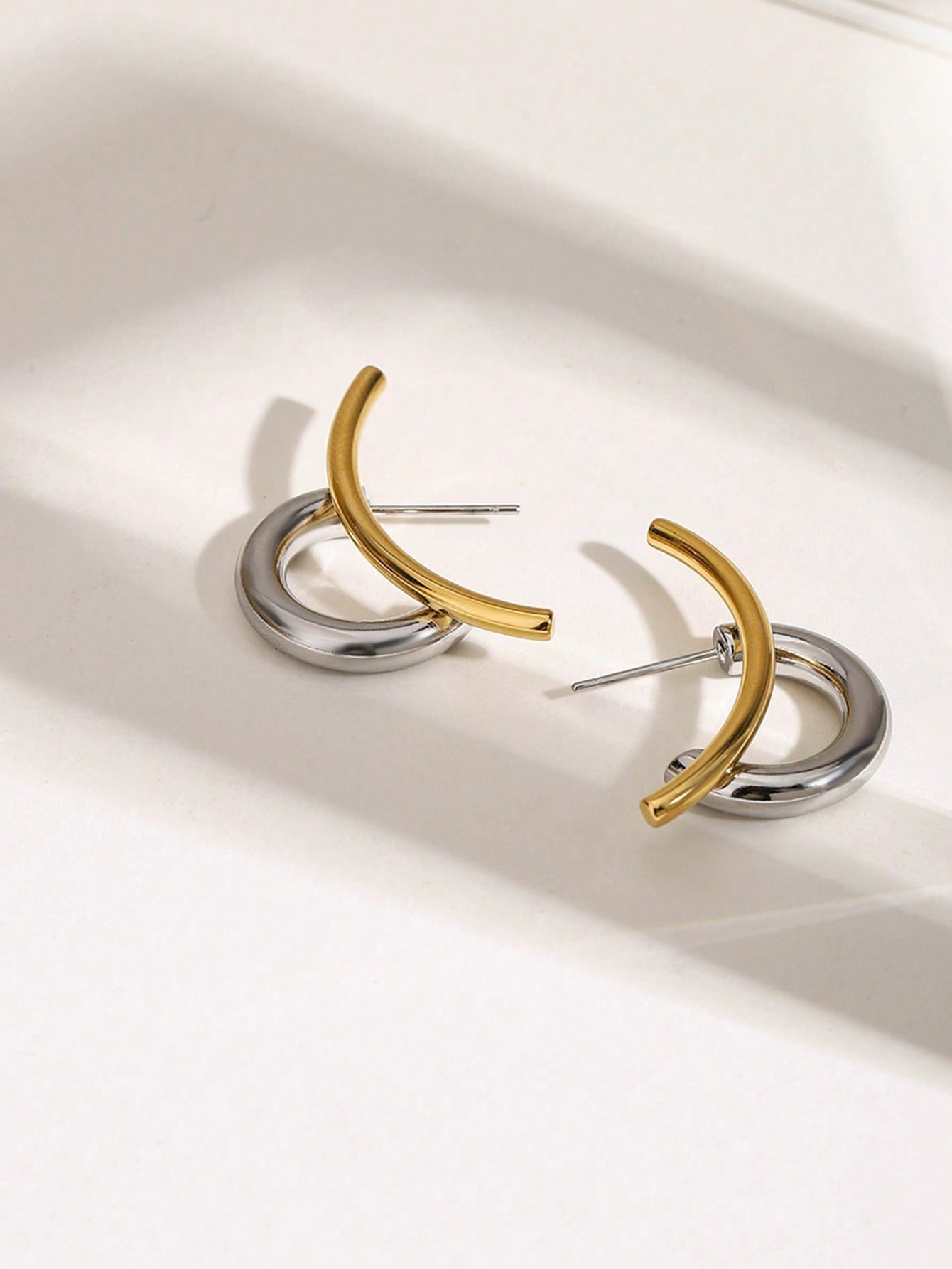 Boucles d'oreilles pour femmes avec lignes contrastées or et argent non terminées de manière symétrique.
